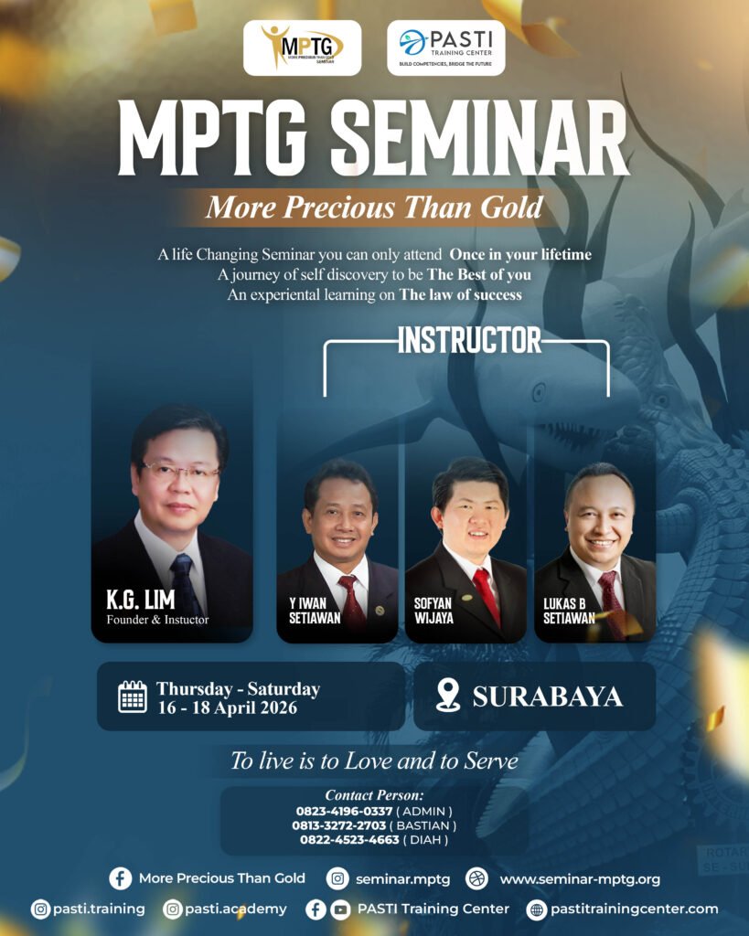 MPTG (More Precious Than Gold) adalah seminar motivasi transformasional selama 3 hari 2 malam yang dirancang untuk membantu peserta menyadari potensi, bakat, dan kemampuan dahsyat dalam diri mereka guna mencapai kualitas hidup yang lebih baik.